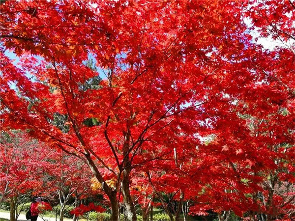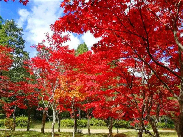 在冬日和煦的陽光下,紅葉色彩更加濃艷,微風(fēng)拂過的瞬間仿若一片燃燒的火海,美不勝收。