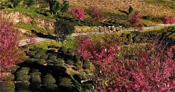 遠(yuǎn)遠(yuǎn)望去,一排排茶樹像一條條綠色的絲帶,縈繞于山間,一樹樹嬌美的粉色櫻花點(diǎn)綴其間,煞是好看。