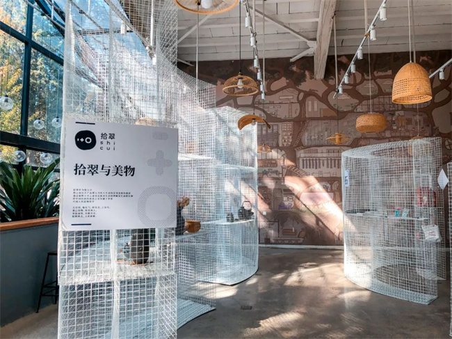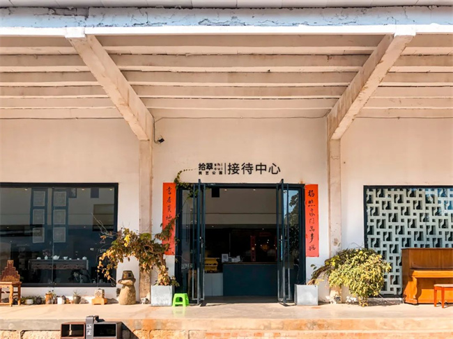 從金鼎山北路14號下車時,一棟巨大的白色建筑便呈現在每一位來者的眼前。沒有巨大的招牌,“拾翠民藝公園”幾個白色的字體就這么立在路邊,低調到不想讓人發現它一般。穿過地面鋪設的石板路,走到接待中心跟前細細打量——這里還殘留著舊時工廠的痕跡。