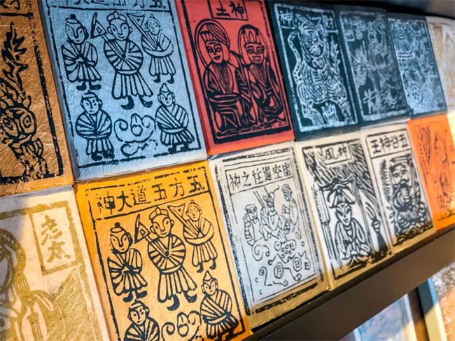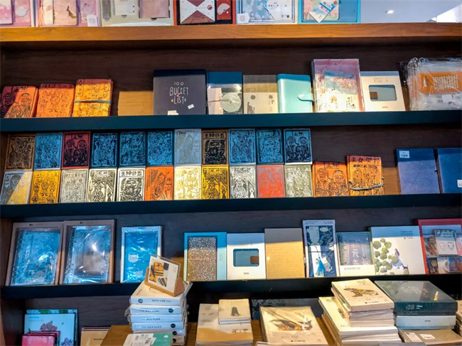 一旁的架子上擺放著白族甲馬制成的手工紙筆記本,那些色差強烈、線條粗獷的神像封面一下子就能抓住人的眼球,獨特而又新穎。