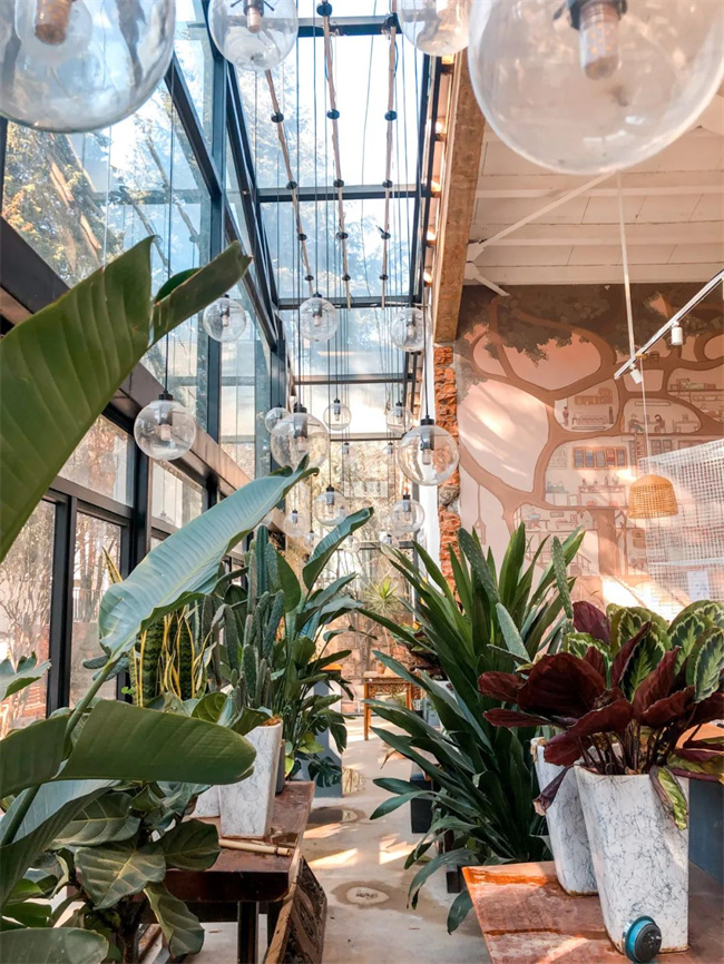而在展廳的左側,這里仿佛是一片室內植物園。吧臺、吊燈、高腳椅,配合著里面伸出來的枝葉,竟然沒有一點違和感。