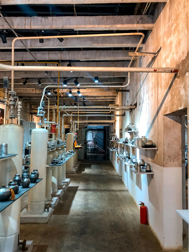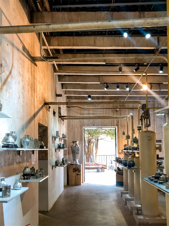 從接待中心左側出來,往坡上稍走幾步,就能看到那高調的「斑錫龍金屬藝術生活館」。這里也是氧氣廠車間的舊址,至今還保留著原來的樣子。這間金屬藝術生活館就地取材,把生產車間直接改造成了陳列館。