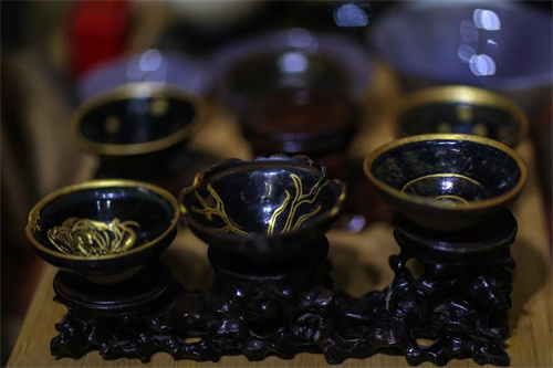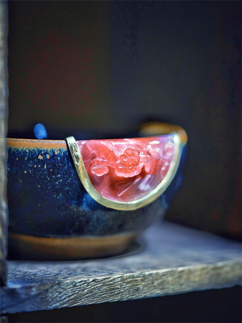 《夢(mèng)魂華夏》:承載著五千年的華夏文明,魂?duì)抗世铮瑝?mèng)回前世,流光溢彩中帶著斑駁的歷史印記,只需一眼,便是五千年的風(fēng)雨飄搖......付忠華從河南、河北等多地博物館中汲取靈感,借助石料獨(dú)特的色澤和裂紋,雕刻出古代文物的出土場景。一方小小的建盞,有春秋的青銅器、宋代的陶器、遼朝的金器,選用遼寧岫巖縣的河磨老玉料全手工雕刻,24k黃金包邊和24K金幣制造完成,低調(diào)奢華,訴說著歷史演變的歲月沉淀,以及中華文化的博大精深。榮獲云南省工藝美術(shù)第十二屆“工美杯”銀獎(jiǎng)等獎(jiǎng)項(xiàng)。