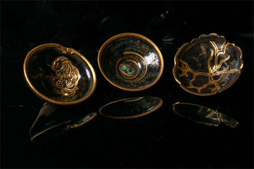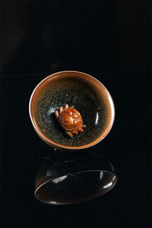 《燒尾》:宋,孔平仲 《孔氏談苑·燒尾宴》:“士人初登第,必展歡宴,謂之燒尾……又說:魚躍龍門,化龍時(shí),必須雷電為燒其尾乃化。”本是宋窯遺址出土的殘次建盞,底部缺失,付忠華用翡翠在碗底處雕刻出一條青龍,將魚躍龍門時(shí)電閃雷鳴,天雷擊去魚尾、魚乃化身成龍的場景生動(dòng)表現(xiàn)出來,透光而看,碗底的青龍澄凈透亮、潤澤又神秘。榮獲中國工藝博覽會(huì)“金鳳杯”銀獎(jiǎng)等獎(jiǎng)項(xiàng)。