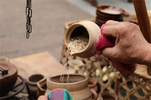 彝家煳米罐罐香茶第一道工序是“溫罐”。首先,將烤罐置于火塘邊進行烘烤,逐步提高烤罐的溫度,有利于茶葉和煳米香氣的發(fā)揮。