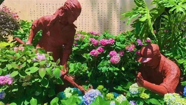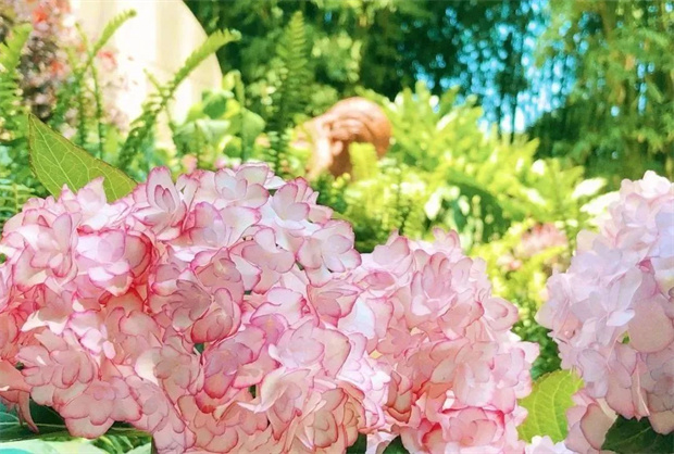 陽光斜照在樹葉上,投下的影子為繡球花打了一把傘。層層疊疊的繡球花開在曲徑通幽的小路旁,引著人進(jìn)入一個又一個多彩夢境。