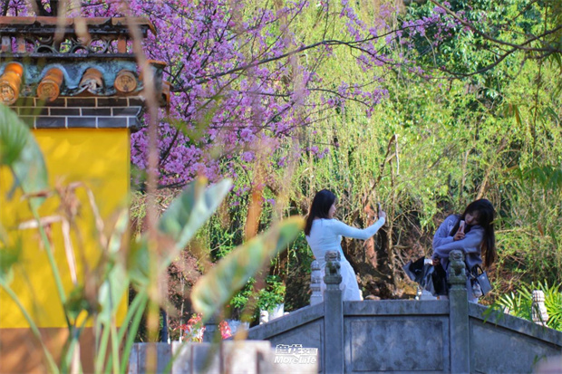 ,花枝低垂處于潭水相接,水波倒映著形成“花影樹影兩婆娑”的奇觀;有的與龍泉觀飛檐斗拱相映成趣,明代茶花與宋
