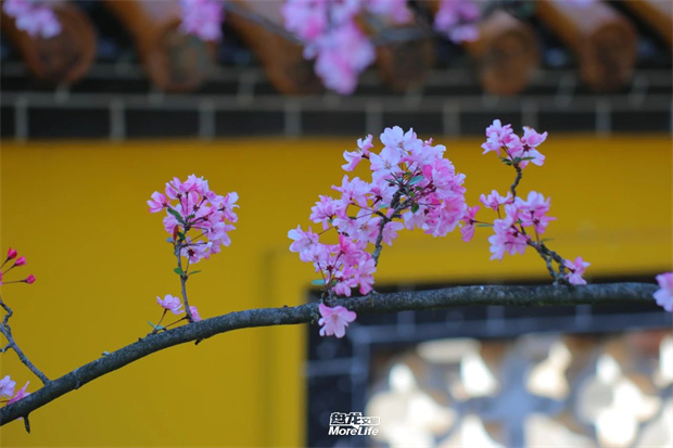 當梅香褪去最后一縷暗香,公園里的垂絲海棠正以漫天緋云的姿態,在古建筑群中織就層層疊疊的春意。有的花枝疊影