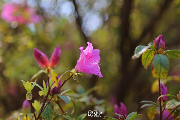 還在感嘆海棠依舊,杜鵑已舉著絳紅火把來接班。新開的杜鵑與落英繽紛的海棠形成奇妙的唱和,海棠的甜香與杜鵑的