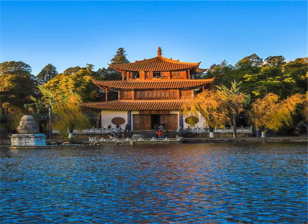 尤其是湖心島上,更是有湖心亭和觀魚樓等清代建筑,飛檐黃瓦造型美觀,與秋日色彩相融,將翠湖點綴得秀麗清新。
