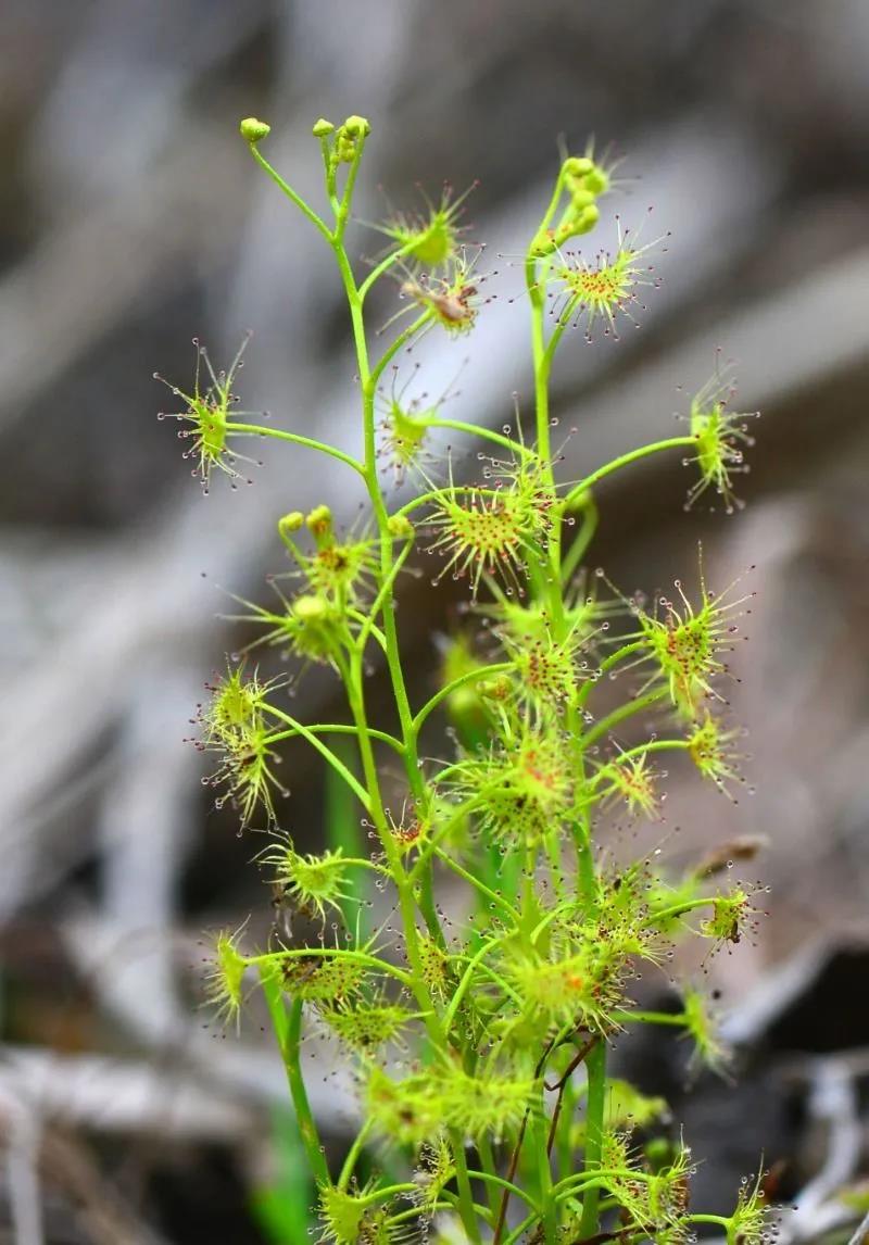 但茅膏菜也有其溫情的一面,它并不會對所有昆蟲“趕盡殺絕”。在它花期時,植株會抽出長長的花序軸,以免誤傷了授粉的昆蟲。為了保護給它授粉的昆蟲,才將花朵開在離葉子較遠的花莖上吧。但茅膏菜的花期很短,在深秋時分,為期數(shù)月的休眠之后,其花期只有短短幾個小時。
