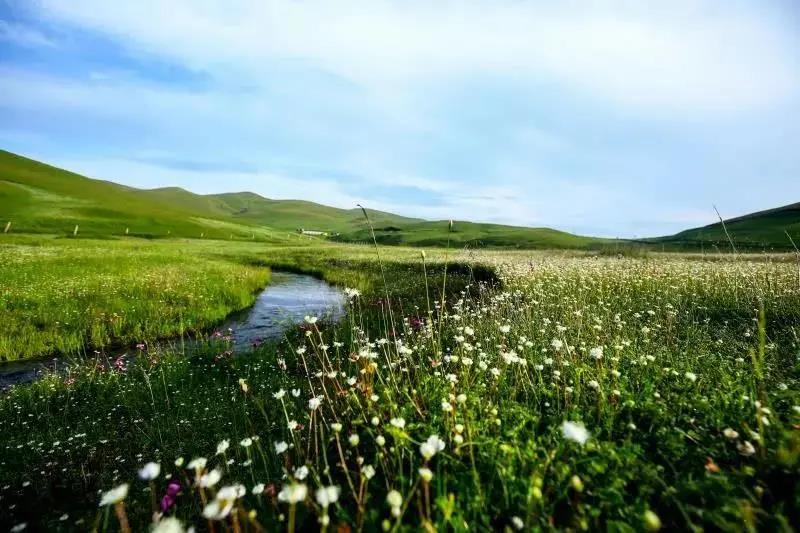 白云鋪在山頂,陽光灑在起起伏伏的草毯,牛羊走在山坡。