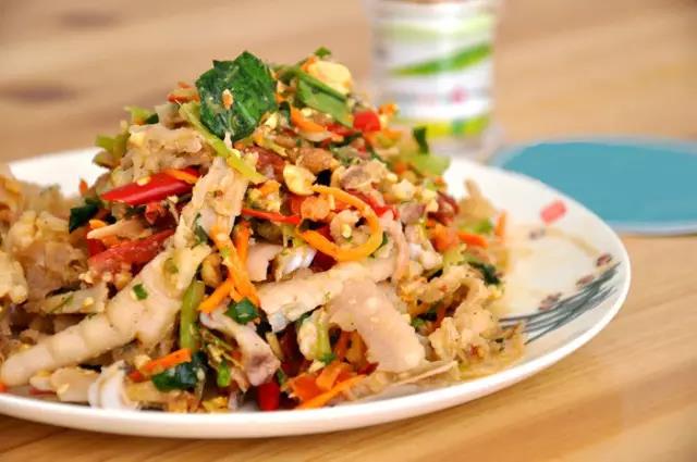 把雞腳放入花生、豇豆、姜蒜、小米辣、香菜等放到石臼里搗碎,口味酸甜微辣。