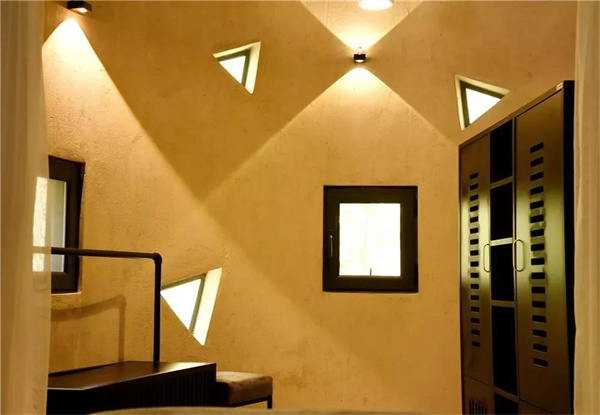 值得一提的是,每間房間設(shè)計(jì)師都在墻壁上,設(shè)計(jì)了三角形狀的窗戶,這些三角窗供給房間采光的同時(shí),本身以三角的形狀給人奇妙夢(mèng)幻之感。床的正上方,留有鏤空的房頂。所有休息區(qū)域的取光,都是依靠鏤空的房頂自然供光。正因如此,在每一個(gè)星河燦爛的夜晚,伴隨著房間舒緩輕柔的音樂,在滿天星月的陪伴下,安然入夢(mèng)。